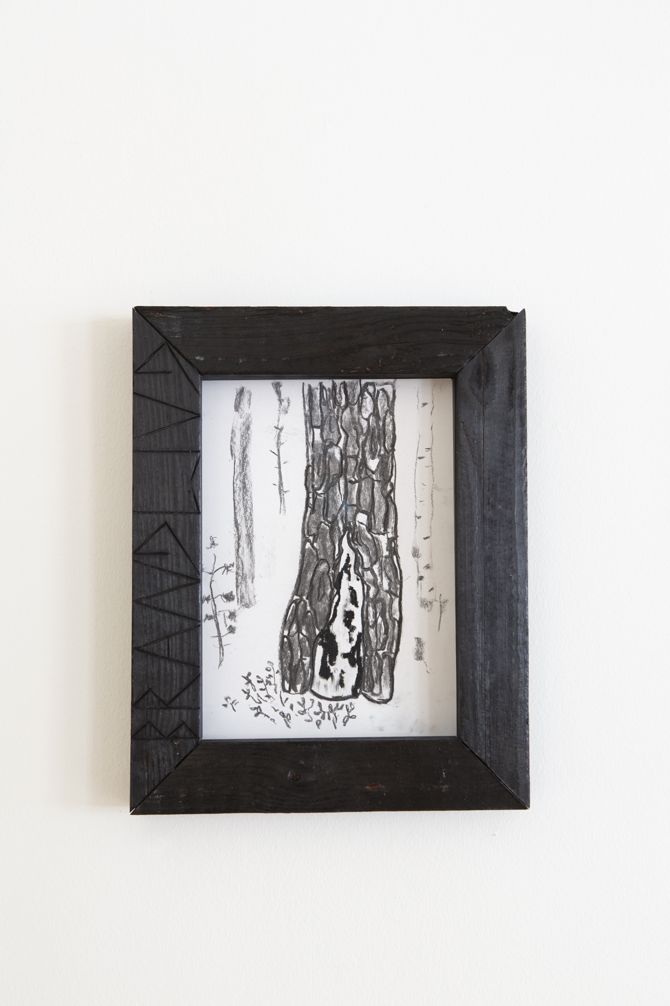 The series title ’Cut and Burn’ is a commentary on the fact that 80% of the wood that is logged is turned into short-lived products like toilet paper, packaging, and biofuels. Most of the harvested wood, therefore, ends up as products that are soon burned up. The frames are custom-made by designer Christian Fisker, using charred pine wood, with carvings inspired by ’fäbodristningar’ a type of local engravings in trees.
