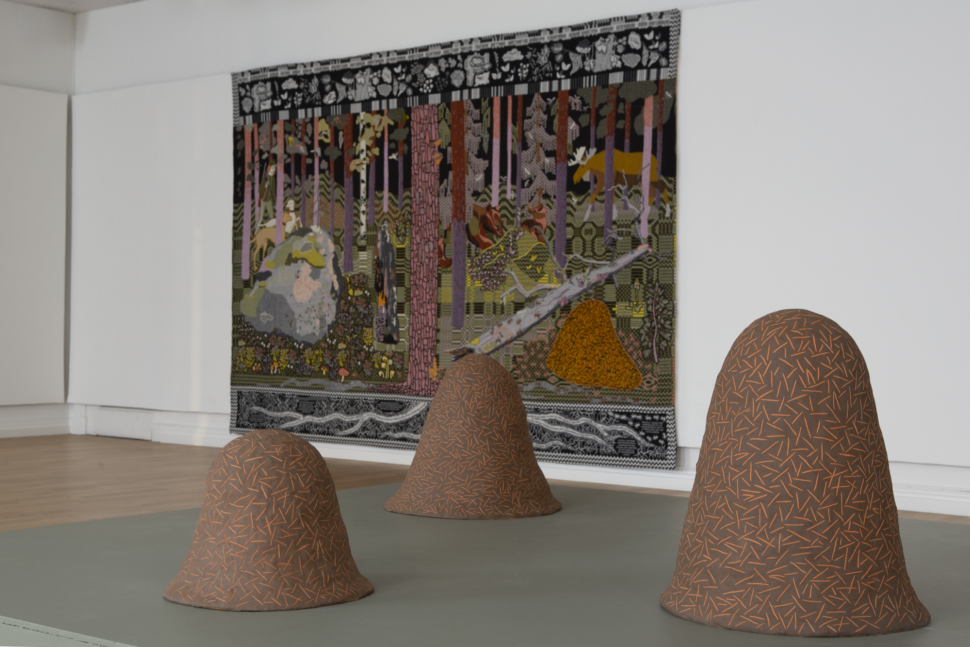 Exhibition at Orsa Konsthall showcasing two large narrative tapestries, drawings and sculptures.