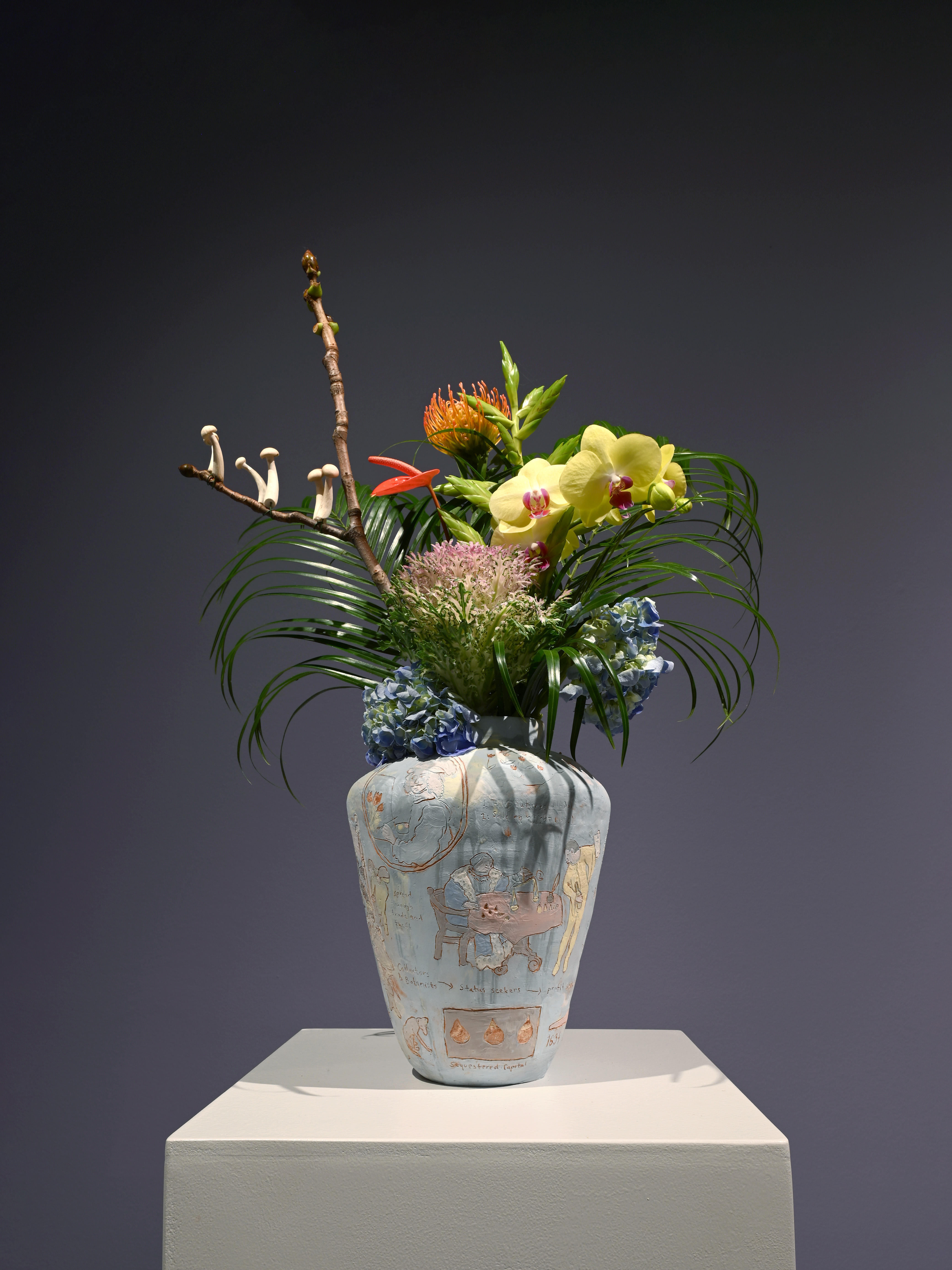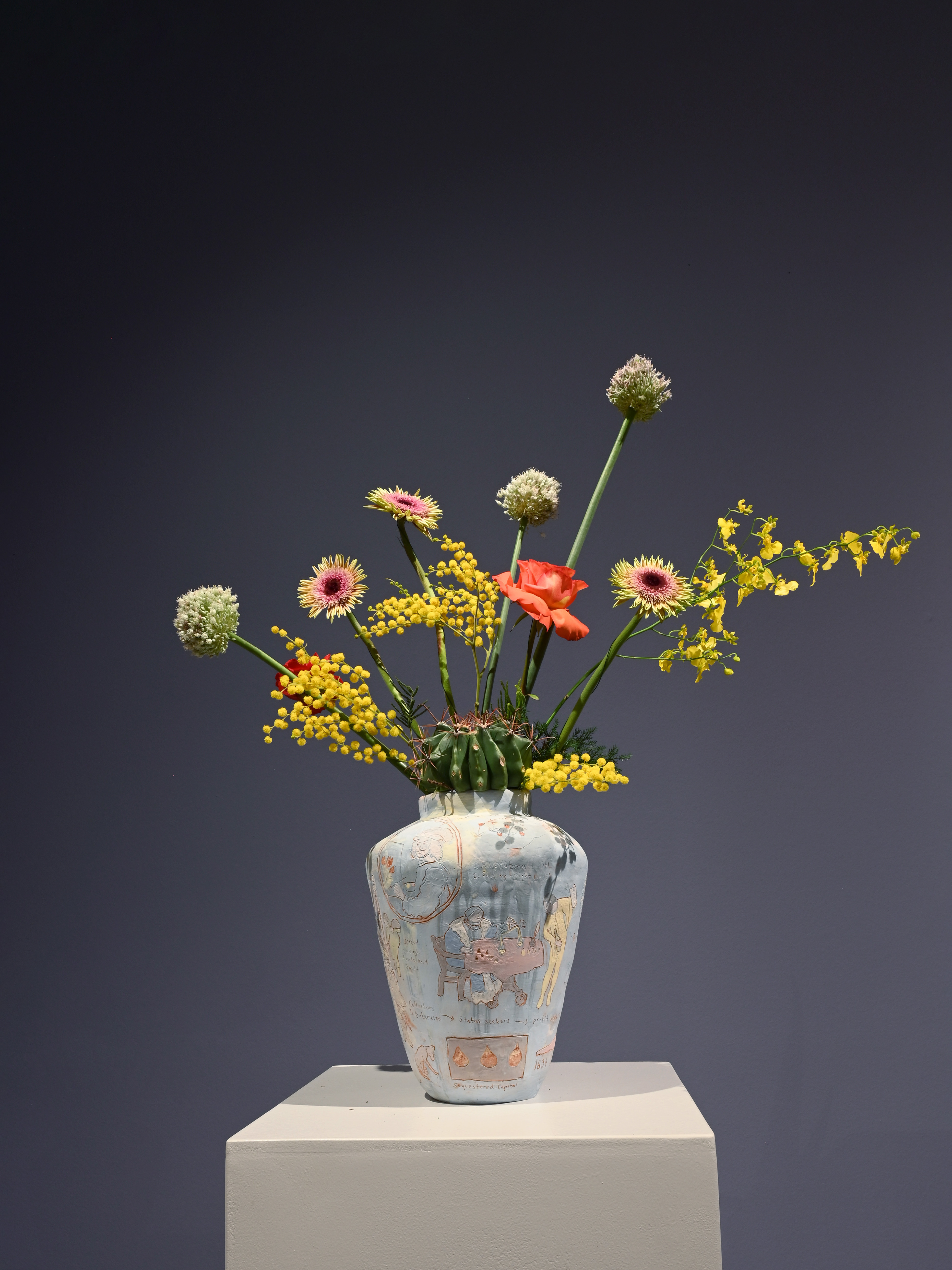 A ceramic vase in marbled ceramics decorated with engobe and engraved motifs. In the vase is a series of nineteen sequential bouquets of fresh flowers, one for each week of the exhibition. Each bouquet spells out a sentence in the language of flowers.