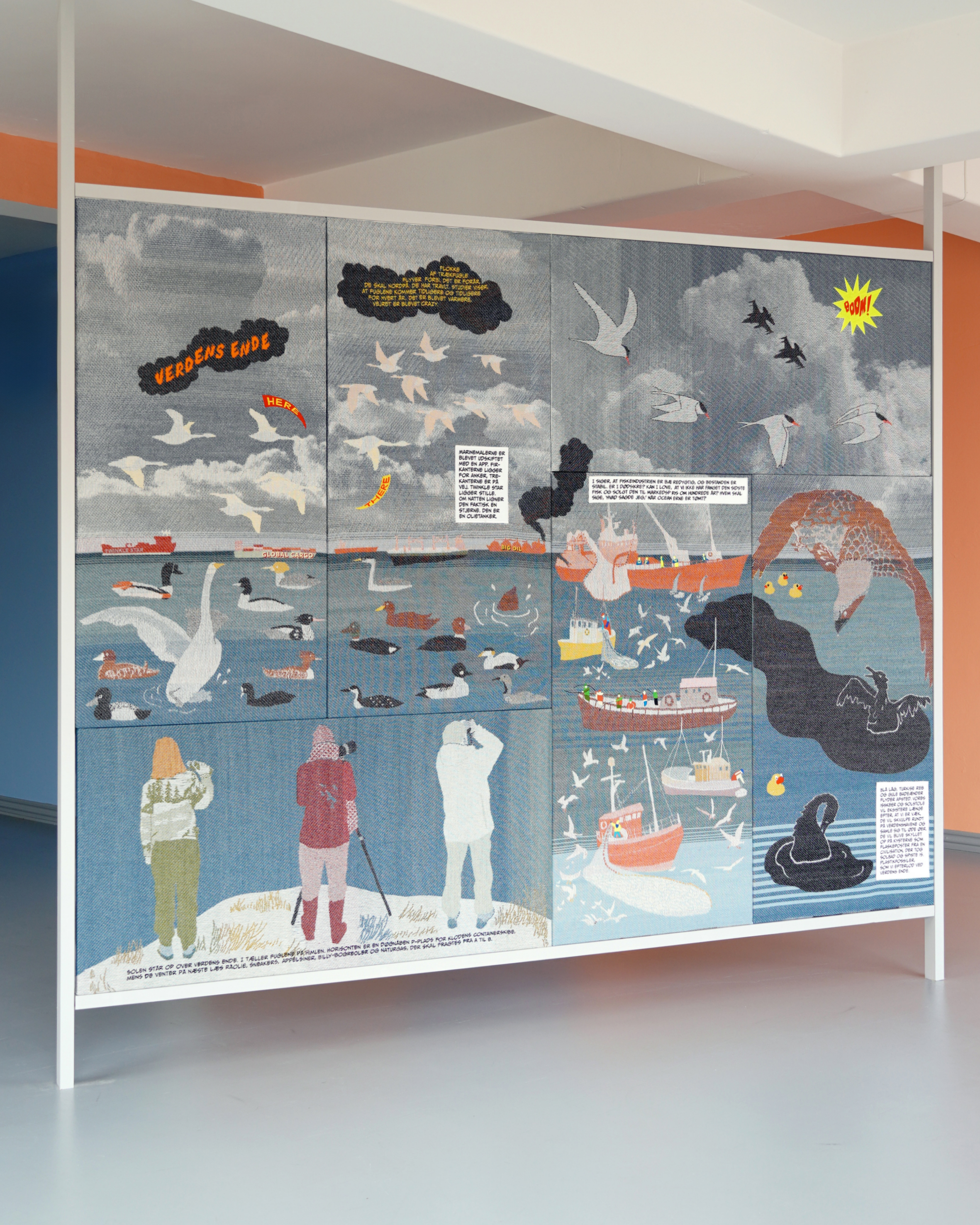 The World’s End is the name of the outermost peninsula of Skagen where many of the local birders go to count birds. Bergmark borrows this ominus name for her large narrative tapestry that turns our gaze to the horizon. The motif tells a story of an age where nothing is untouched by humans, not even the sky that meets the sea at the horizon, or the flight of birds crossing the sky.