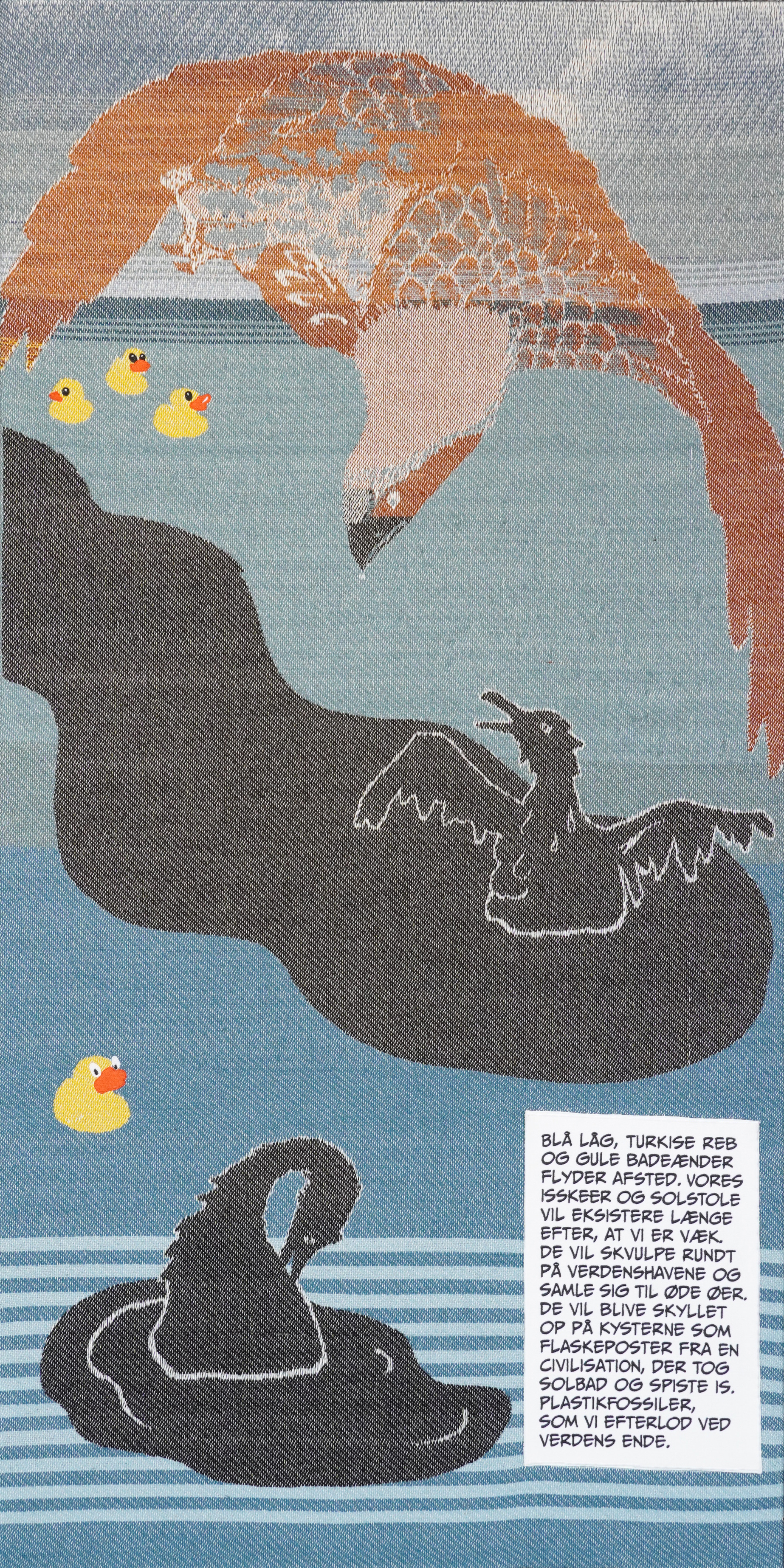 Bergmark builds a visual narrative of the ongoing ecological crises in a time when the impacts of climate change and biodiversity loss are increasingly perceptible in our everyday life. Dead fish are washed ashore, suffocated by oxigen depletion, the weather is crazy, the fall is hot, and violent cloudbursts cause floods all over Denmark. Embroidered on the weave are short texts that capture feelings of fear, sorrow, and loss sometimes diagnosed as climate anxiety.
